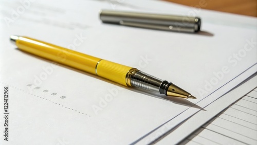 A yellow ink pen lying on top of a sheet of white paper with a slight shadow effect, yellow ink pen, office supply