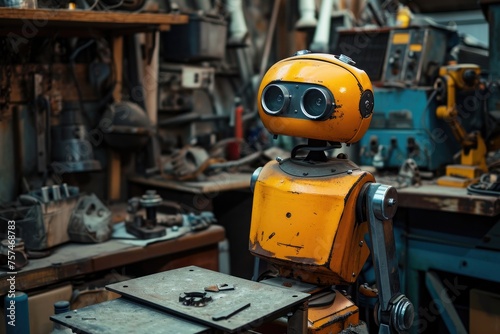 A yellow robot sits atop a wooden table, showcasing its vibrant color against the rustic background, A robot undergoing repairs in a mechanic's workshop, AI Generated
