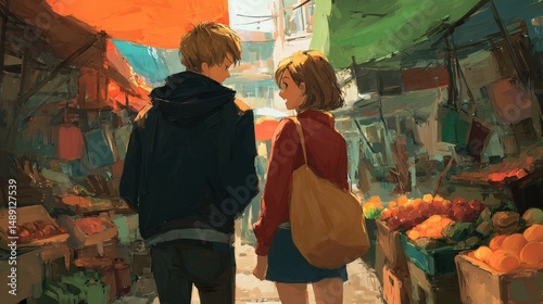 A young Asian couple strolls through a vibrant marketplace, their conversation hinting at shared moments and unspoken connections.