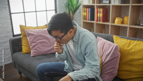 asian, man, coughing, sitting, couch, modern, living, room, indoor, home, ill, sick, male, adult, furniture, sofa, unwell, interior, house, comfort, lifestyle, young, casual attire, alone, health, cold, flu, symptom, contemporary, work, resting, well-being, sneeze, relaxing, bookshelf, pillow, goggles, disease, urban, safety, allergy, apartment, sad, depressed, emotion, expression, solitude, bachelor, discomfort