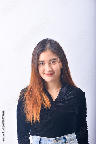 A young Asian Woman in a Black Velvet Top and Denim Jeans making expressive gestures Isolated on white background