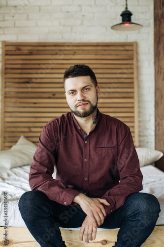 A young bearded man sits in bed and looks into the camera