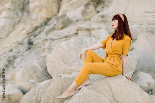 A young beautiful brown haired girl in fashionable yellow overalls poses on sunny summer day, sitting on the stone in front of sand quarry outdoors. Summer lifestyle and fashion concept. Copy space