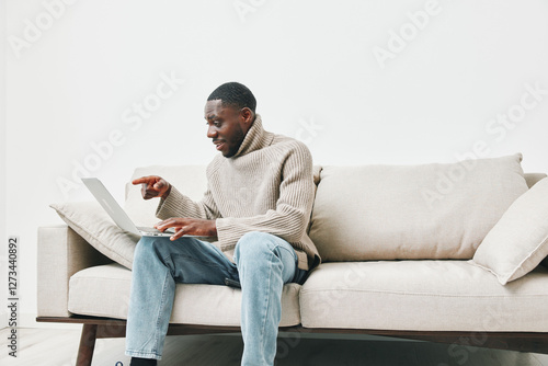 A young Black man joyfully working on a laptop at home, dressed in a cozy sweater and jeans, set against a minimalistic white background