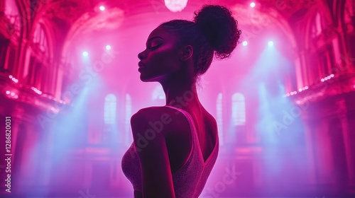 woman, person, silhouette, fashion, dress, light, stage, spotlight, pink, purple, room, hall, architecture, building, artistic, elegant, graceful, pose, profile, view, side, indoor, studio, performance, dancer, ballet, dance, movement, art, dark, back, figure, glowing, beauty, expressive, serene, peaceful, thoughtful, mysterious, dreamlike, fantasy, modern, high-coloured, texture, sharpened, bokeh, blurred