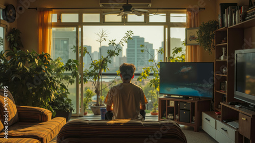young, boy, sitting, couch, watching, television, living, room, television, facing, large, window, view, city, skyline, background, decorated, plant, ceiling, fan, right, side, wooden, bookshelf, wearing, yellow, t-shirt, armrest, looking, out, floor, covered, beige, carpet, 2, orange, striped, foreground, atmosphere, cosy, inviting, indoor, potted, seating, entertainment, home, interior