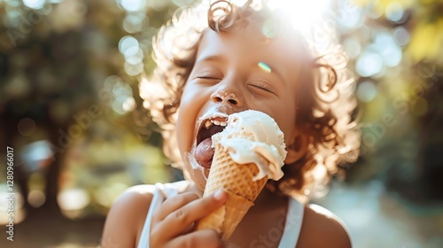 A young boy with curly hair enjoys an ice cream cone on a sunny day.