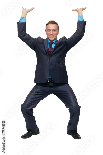 A young business man stands on bent knees and holds his hands above his head as if he is carrying something or holding it, isolated on white background.