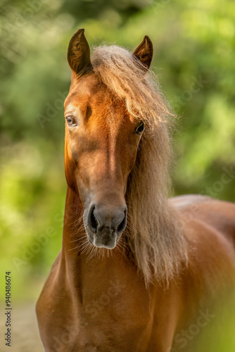 A young chestnut brown icelandic horse mare on a pasture in summer outdoors