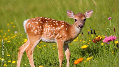 A young deer stands in a field of colorful flowers, surrounded by green grass.