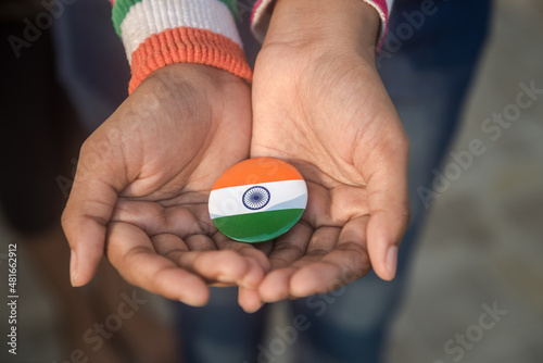 A young girl holding a metal badge with Indian flag colors in her palm. A conceptual photo depicting a love and respect for mother India.