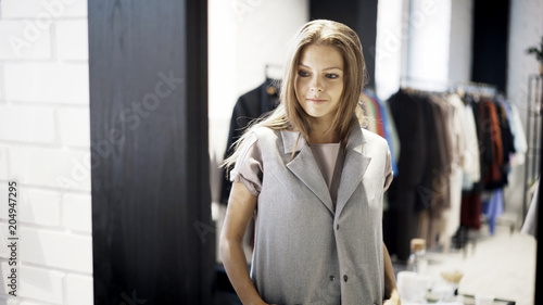 A young girl is trying on a gray jacket in a shop in a fitting room looking at herself at the mirror