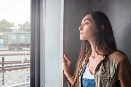 a young girl looks out of the train door. the girl goes on vacation