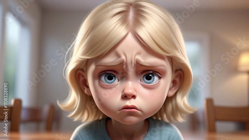 girl, children, sad, unhappy, upset, sulk, frown, blond, blue eye, portrait, face, expression, emotion, mood, feeling, young, small, cute, adorable, innocent, childhood, children, little, human, closeup, studio, white background, indoor, home, interior, light, bright, natural, soft, gentle, digital artwork, illustration, cartoon, anime, three-dimensional, rendering, realistic