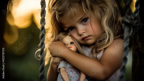 A young girl with blonde hair sits on a swing, holding a doll close to her chest, while looking pensively at the camera.