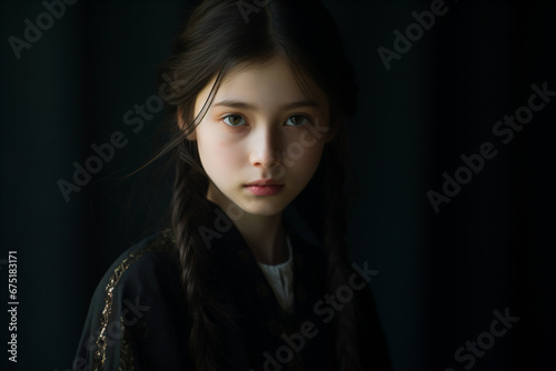 a young girl with long hair and a black jacket