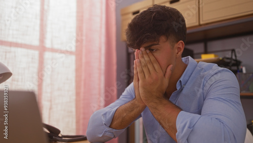 A young hispanic man looks stressed while sitting in an office room with his hands covering his face.