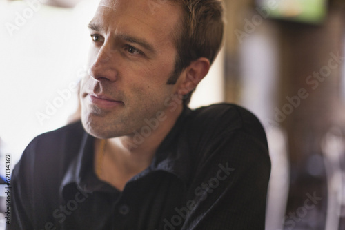 looking, looking away, determination, sharpened, relaxation, black, north america, us, pennsylvania, philadelphia, horizontal, photo, selective focus, shirt, t-shirt, bar, wine bar, eatery, indoor, outdoors, beauty, lifestyle
