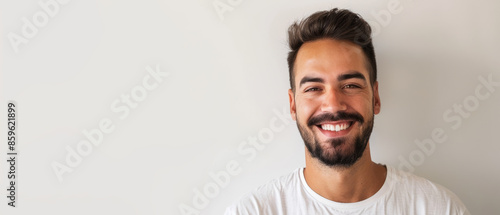 A young man in a white t-shirt smiles brightly at the camera, showcasing a charming and friendly demeanor against a simple background.