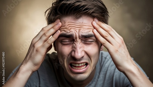 A young man struggles with a debilitating migraine,he desperately attempts to find solace by pressing his fingertips .