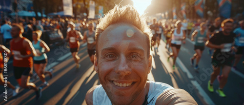 A young man with spiky blonde hair takes a selfie while running in the city marathon. Behind him is a crowd of other runners wearing colorful