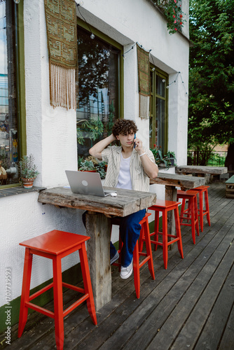 A young person sits at a wooden table outside a cafe, working on a laptop while talking on the phone. Bright red stools and greenery enhance the lively atmosphere of the setting.