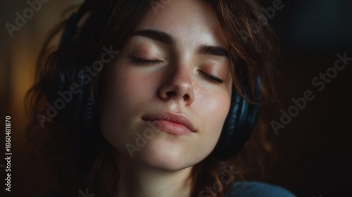 A young woman listening to music with eyes closed, lost in the sounds, wearing headphones. The image captures a moment of peace and tranquility