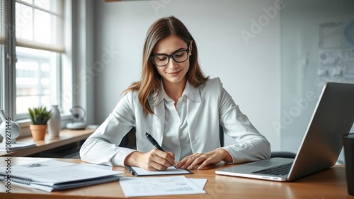 A young woman sits at a desk in a modern office, focused on writing important information on a piece of paper, work, female