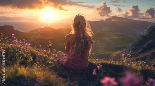 woman, sunset, mountain, nature, hill, grass, sky, cloud, flower, landscape, view, panorama, horizon, scenery, peaceful, tranquil, serenity, relaxation, contemplation, solitude, joy, happiness, hope, inspiration, beauty, awe, wonder, freedom, travel, adventure, wilderness, outdoors, summer, evening, golden hour, light, shadow, silhouette, back, hair, long hair, pink, green, blue, yellow, orange, red