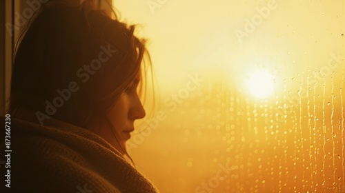 A young woman sitting by a large rainstreaked window gazing thoughtfully into the distance with a gentle smile playing on her lips wrapped in a cozy blanket as the golden hues of the setting sun fill