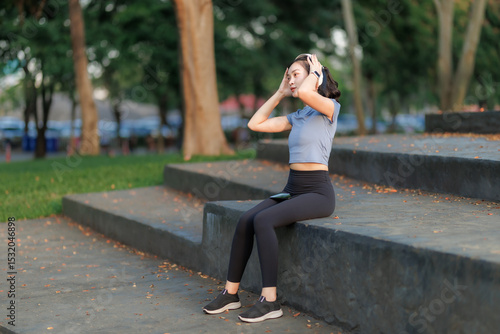 A young woman takes a break after exercising, relaxing with a cheerful smile. She wears headphones, listens to music, and chats with her friend on the phone, enjoying the peaceful moment.