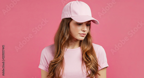 A young woman wearing a plain pastel pink baseball cap and pastel pink T-shirt. Lady girl with long hair. Plain pink background