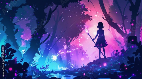 woman, forest, magic, fantasy, art, illustration, digital, glowing, light, night, dark, magical, whimsical, dreamy, enchanted, nature, background, purple, blue, green, style, character, powerful