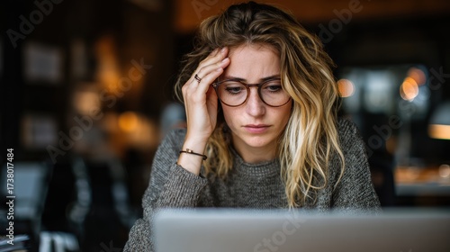 A young woman with glasses experiences stress while working on her laptop in a cozy cafe setting.