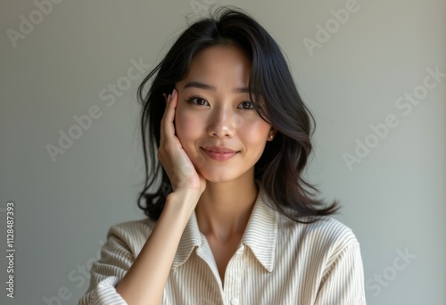 A young woman with long black hair smiles gently, her hand resting on her cheek.