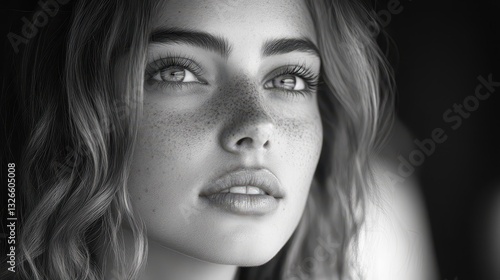 portrait, woman, freckle, expression, gaze, beauty, eye, emotion, soft, sharpened, face, model, natural, young, thoughtful, feature, serene, light, art, aesthetic, skin, hair, youth, elegance, charme, innocence, contemplative, portraiture, closeup, visual, attractiveness, isolation, calm, elegant, graceful, delicate, lifestyle, monochrome, character
