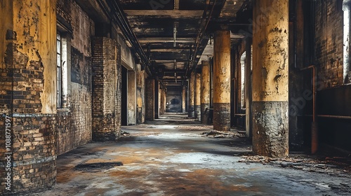 abandoned, building, hallway, decay, ruin, old, brick, wall, column, floor, dark, light, texture, grunge, industrial, factory, architecture, interior, space, empty, forgotten, mystery, atmosphere, creepy, eerie, desolate, vintage, retro, damaged, worn, dilapidated, derelict, exploration, photo, photo, image