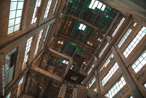 abandoned, architecture, building, ceiling, concrete, factory, horizontal, perspective, skylight, window