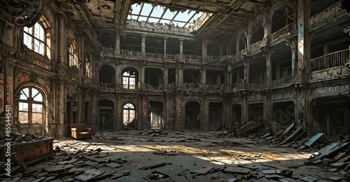 abandoned gothic palace house mansion building interior. post apocalyptic old castle ruins. large empty room with rubble, junk, and debris.