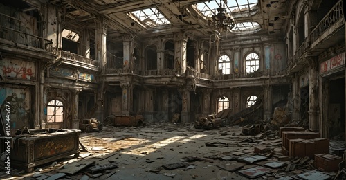 abandoned gothic palace house mansion building interior. post apocalyptic old castle ruins. large empty room with rubble, junk, and debris.