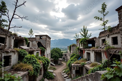 city landscape, ruin, overgrown, vegetation, desolate, environmental, silence, hi-res, crystal-clear, vine, moss, tree, urban decay, ghost town, apocalypse, survival, eerie, melancholy, dramatic sky, wildlife, city landscape, solitude, time passing, atmospheric