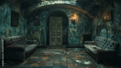 Abandoned Teal Room Vintage Sofas and Door, Haunted House Interior Design.