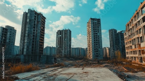 Abandoned urban landscape featuring dilapidated high-rise buildings surrounded by overgrown vegetation under a bright blue sky with scattered clouds, evoking a sense of desolation