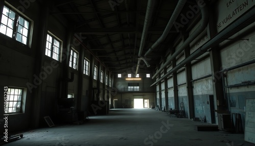 abandoned, warehouse, interior, sunlight, window, shadow, empty, space, industrial, urban, decay, architecture, afternoon, light, structural, deserted, history, restoration, exploration, atmosphere, minimalism, design, line, texture, depth, environmental, loneliness, eerie, quiet, tool, machinery, relic, desolate, calm, stillness, landscape