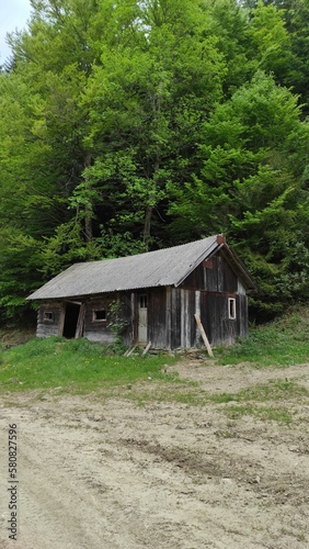 Abandoned wooden building in the forest, Ukraine