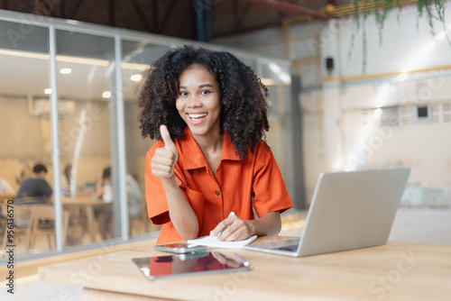 About successful young woman concept. Excited African American woman sitting at working desk.