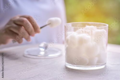 Absorbent cotton balls and cutton sawbs in cotton container with morning sunrise background. This cotton is used medical purposes in hospital and nursing home to cleaning the skin, bathing wounds etc