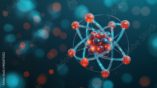 Abstract 3D rendering of an atom with electrons orbiting the nucleus. Blue and red color palette. Science and technology concept.