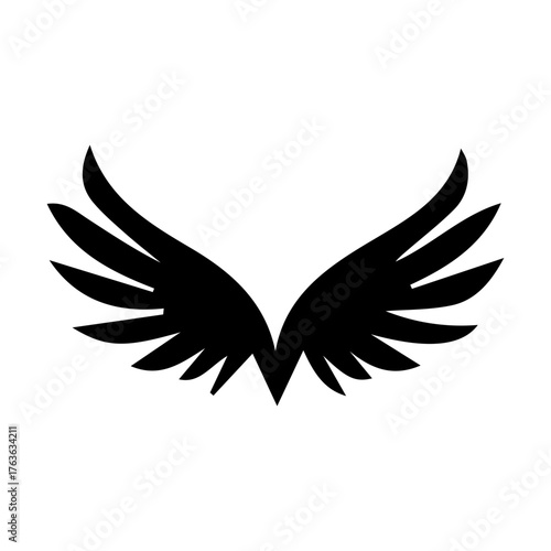 wing, feathered, pair, symmetric, abstract, stylised, design element, flight, flying, air, freedom, spirit, angel, power, speed, motion, dynamic, logotype, emblem, icon, graphic, vector, illustration, silhouette, black-and-white, monochrome, bird, bird of prey, phoenix, celestial, heavenly, spiritual, fashion, apparel, brand, identity, modern, clean, elegant, beauty, grace, lightweight, aviation, transport, automotive, badge, creativity, art, tattoo
