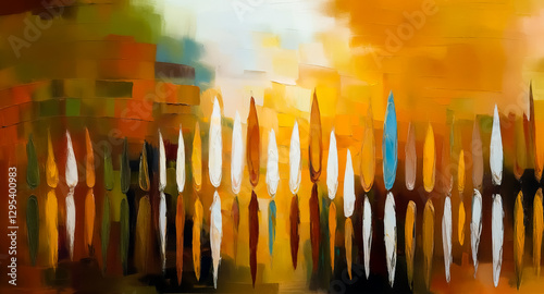 Abstract art in warm hues featuring vertical forms against a blurred backdrop of orange, yellow, brown, blue, and green.